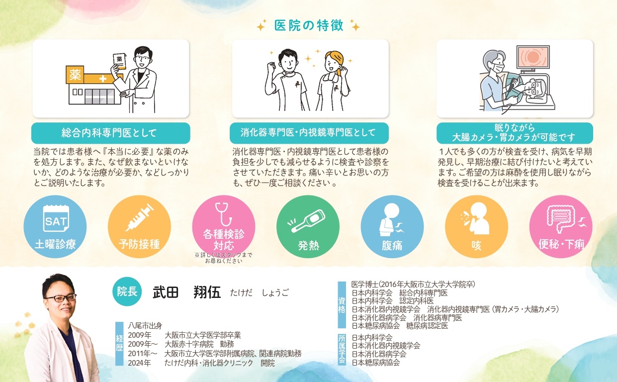 はじめまして、たけだ内科・消化器クリニックの院長の武田 翔伍(たけだ しょうご)と申します。